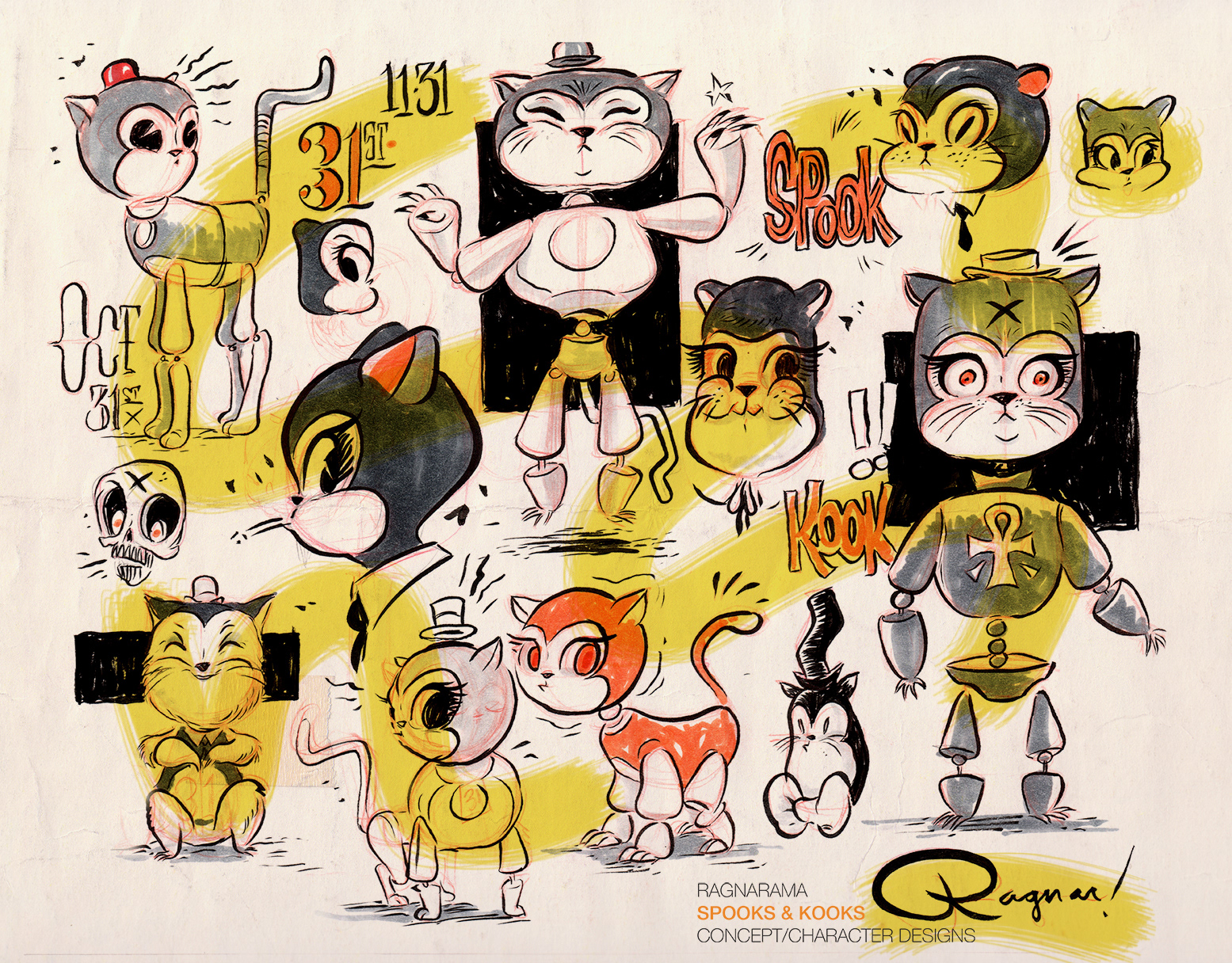 Here's a bunch of rough character designs for a halloween stage show featuring large marionettes.